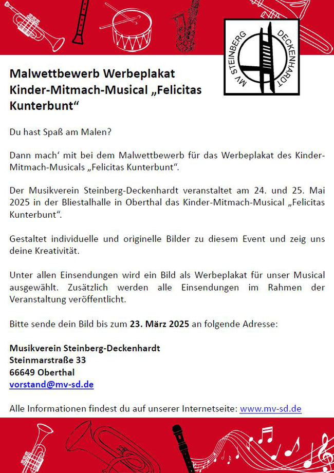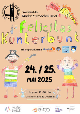 Der Musikverein Steinberg-Deckenhardt lädt alle kleinen und großen Musical-Fans zu einem besonderen Erlebnis ein: Am 24. und 25. Mai 2025 wird in der Bliestalhalle in Oberthal das Kinder-Musical „Felicitas Kunterbunt“ aufgeführt.